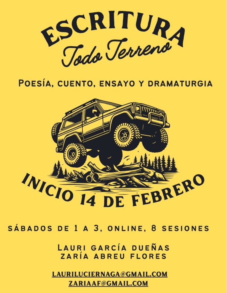 Hace unos días me enteré sobre el próximo “Taller Escritura Todo Terreno” dirigido a mujeres mayores de 15 años que tengan interés en explorar los géneros de poesía, ensayo, cuento o dramaturgia. Las escritoras y periodistas Lauri García Dueñas y Zaría Abreu Flores impartirán la tercera emisión de este taller de 8 sesiones semanales, a iniciar el próximo 14 de febrero de 2026.